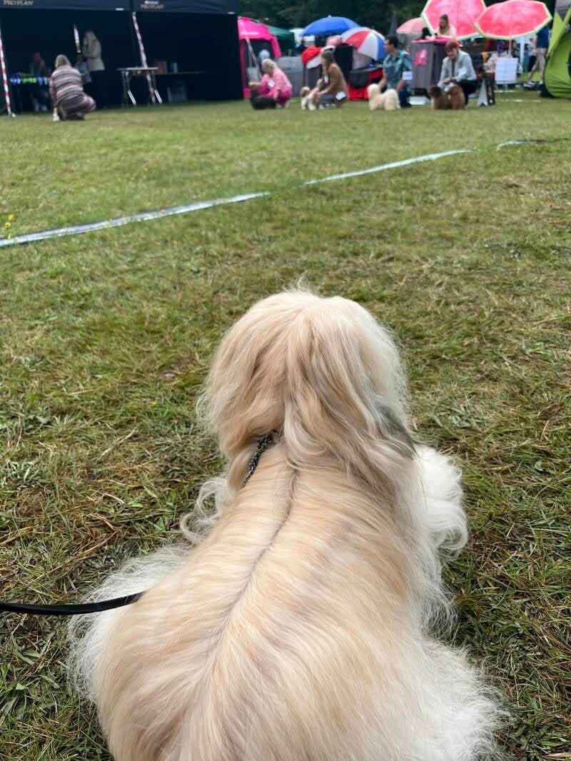 Zondagochtend pakken we de spullen bij elkaar en lopen naar het veld. De dag begint nog wat bewolkt, maar daar zal heel snel verandering in komen. We kunnen onze tent opzetten direct aan de ring. We zijn ook vrijwel direct bij opening van de show aan de beurt. Dus snel de honden klaar maken en de ring in. Er doen 25 Havanezers mee aan de show.