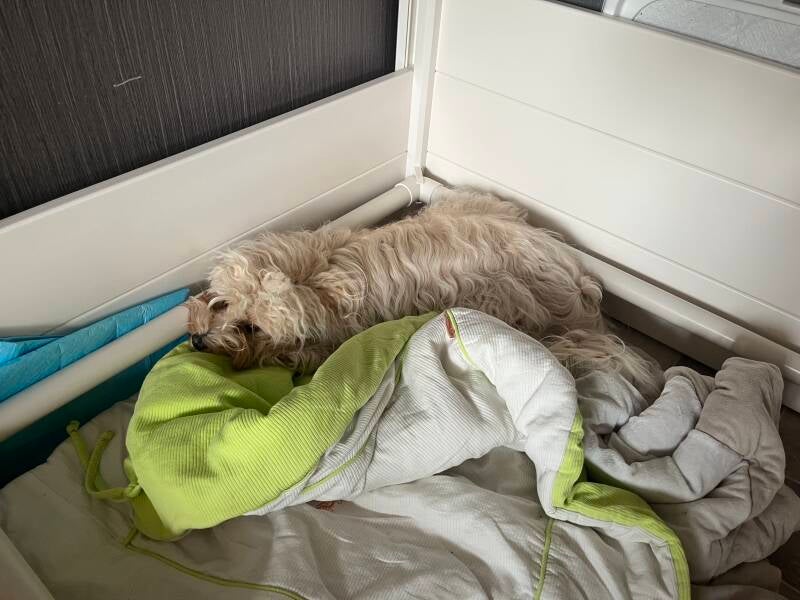 Vrijdag 6 Juni begon de temperatuur van Britt te zakken. dus de bevalling zal niet meer zo lang duren. Die avond was Britt onrustig en graven in de werpkist. We dachten nu gaat vast gebeuren in de nacht. Chiel is al naast de werplist gaan slapen om alles in de gaten te houden. De hele nacht was er nog niks aan de hand behalve wat weeen. De ochtend werd ze steeds onrustiger en steeds meer weeen. dus het kon nu wel eens gaan gebeuren. En ja hoor om 8:47 was daar de eerste puppy een teefje.